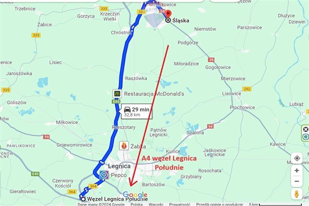 A4 węzeł Legnica Południe w odległości 33 km z dojazdem drogą S3